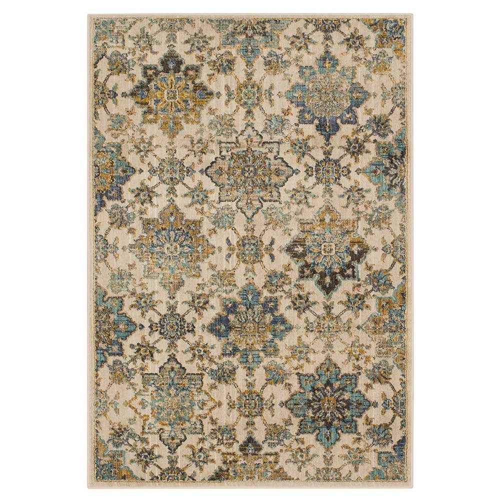 Featuring an elegant floral pattern and delicate distressed detailing, the Isabella woven area rug is a charming addition to any space in your home. Its stain and fade resistant properties make it a great choice for busy families. Colors include gray, pale green, watery blue, and warm beige.